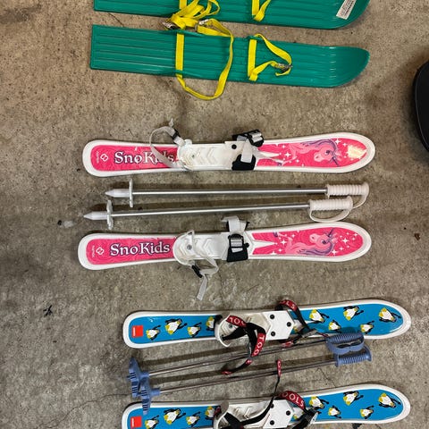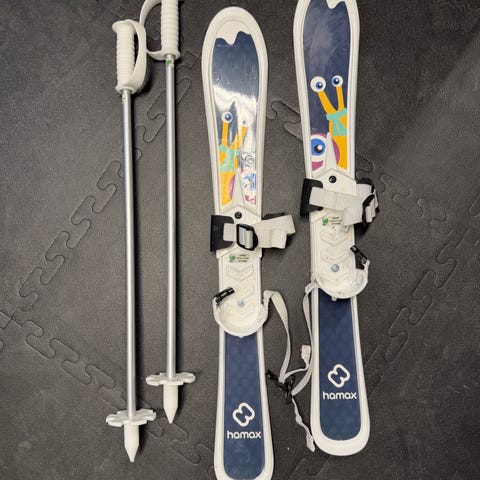 Hamax barneski med staver i blå og hvit farge. Skiene har integrerte plastbindinger med reimer som kan justeres over skoen. Medfølgende staver har store håndtak som er enkle å gripe for barn. Egnet til lek og enkel skigåing for mindre barn på flatt eller lett kupert underlag.