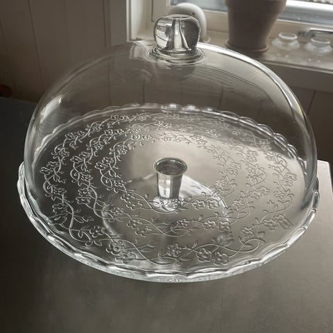 IKEA kakefat med lokk i klart glass. Fatet står på stett og har mønstret bunn, med tilpasset kuppel som dekker hele fatet. Egnet til servering og oppbevaring av kaker, bakverk og andre desserter på kjøkken eller spisebord. Kan brukes både til hverdags og ved selskap og sammenkomster.