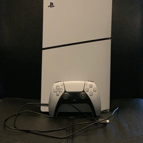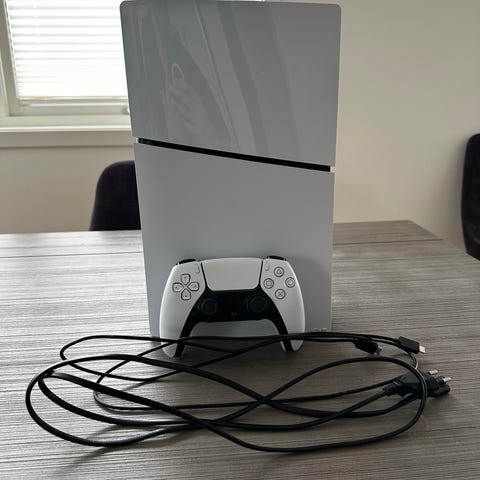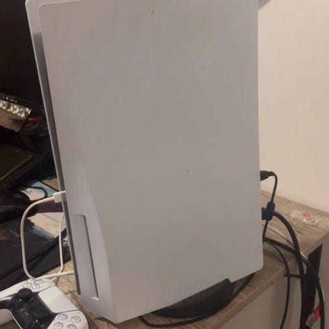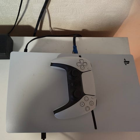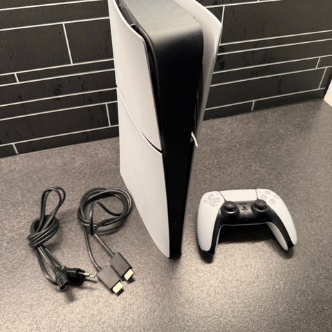 Med følger én UBRUKT DualSense trådløs kontroller i hvit/svart, originalt stativ for vertikal eller horisontal plassering, strømkabel og HDMI-kabel. Det følger også med USB-kabel for lading. Konsollen har innebygd lagring, nettverkstilkobling og USB-porter for tilbehør og lading.