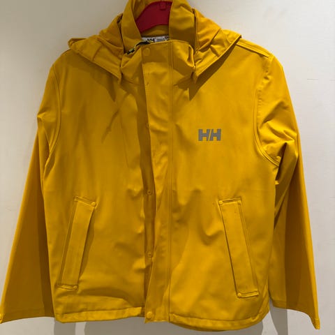 Pent brukt gul regnjakke fra Helly Hansen i juniorstørrelse 176 (tilsvarer ca. 16 år).