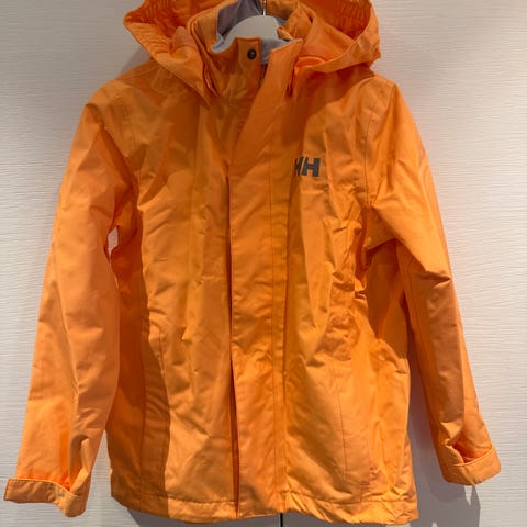 Helly Hansen vind- og regnjakke for barn i størrelse 128. Modellen har fast hette, hel glidelås i front og refleksdetaljer.
