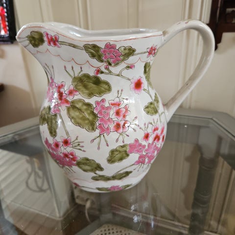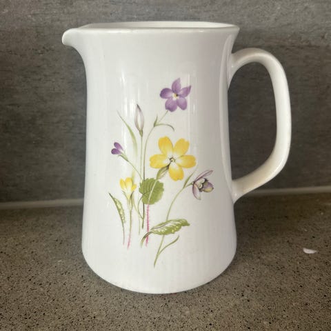 Karaffel mugge i keramikk. Muggen er hvit med rosa kant øverst og håndmalt blomsterdekor i rosa og grønt på den ene siden. Den har helletut og hank for enkel servering. Egnet til servering av vann, saft, melk eller andre drikker, eller som dekorativ gjenstand i kjøkken eller spisestue.