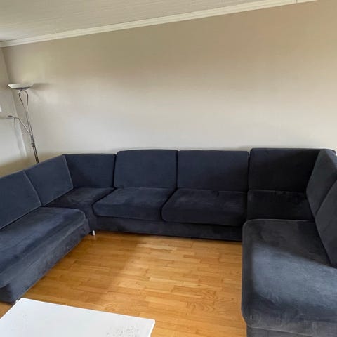 Selger en moderne hjørnesofa i mørk grå farge. Veldig god å sitte.