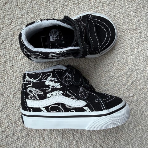Overdelen er i tekstil og semsket materiale, og skoene har to borrelåsstropper som gjør dem enkle å ta av og på. Yttersålen har klassisk Vans-vaffelmønster i gummi for godt grep.
