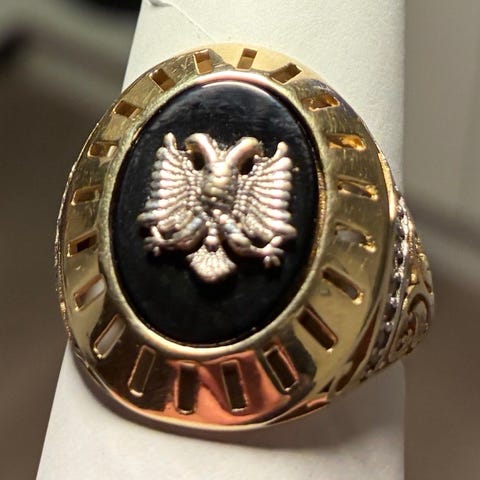 14kt 585 gult gull med hvitt gull motov og på sidene.
