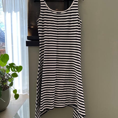 Flott blå kjole fra marimekko med små sorte prikker med lommer . Behagelig strechy stoff passer 40/42 avhengig av hvor løs fasong man ønsker . Nypris ca 2000