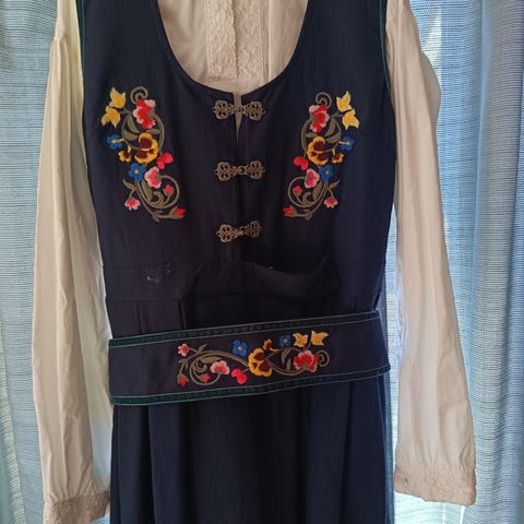 Nydelig festdrakt i utmerket kvalitet. Lekkert blått ullstoff, med vakre blomsterbroderier og kantebånd i fløyel. Blusen er ny og ikke brukt i en nydelig grønnfarge som passer perfekt til drakten. Komplett sett med stakk, skjorte og veske. Str. M/L
