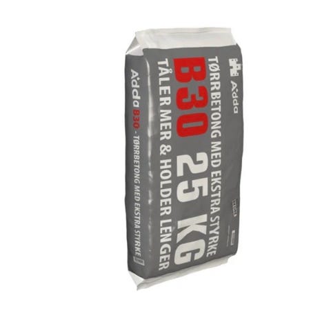 B30 Proff tørrbetong i sekker, egnet til støpearbeid som gulv, fundamenter og reparasjoner innendørs og utendørs. I tillegg følger det med støperør.