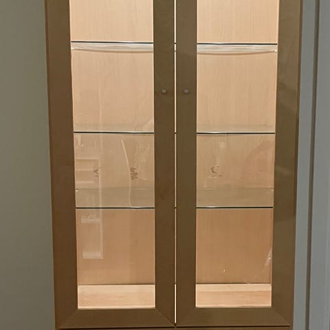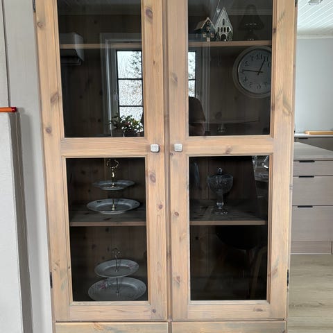 Skapet har glass i dørene og fire hyller, tre av dem kan justeres.