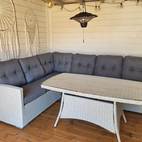 Hjørnesofa utemøbelsett med bord i grå kunstrotting.