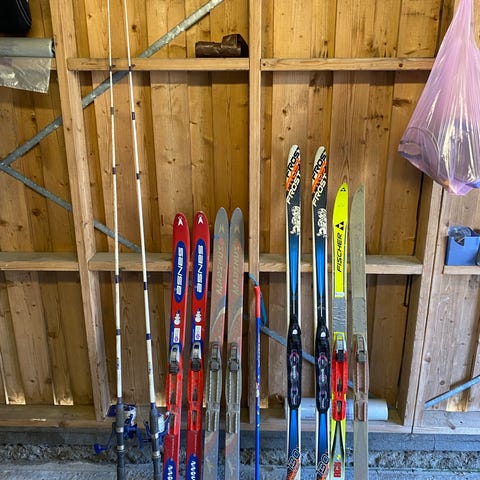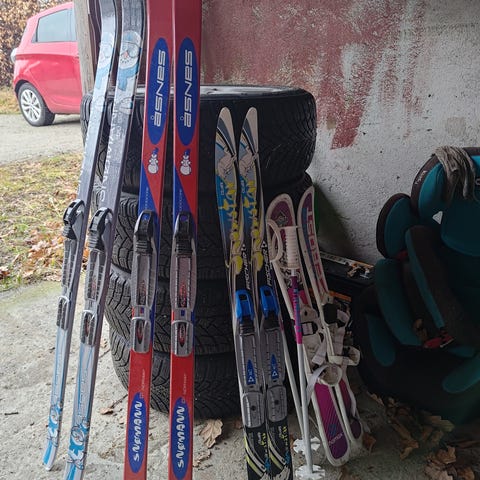 Diverse gamle ski i varierende stand gis bort. Her er gamle treski og andre nostalgiske retroski som kan egne seg som pynt på hytta eller lignende. Varierende stand og ulike typer bindinger.