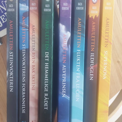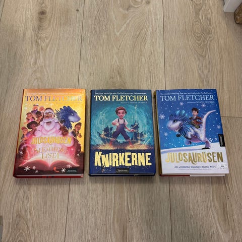Mitt skattkammer bokserie barnebøker i rød innbinding. Kun én er synlig brukt (nr 2) Bøkene inneholder eventyr, fortellinger, rim og regler for barn.