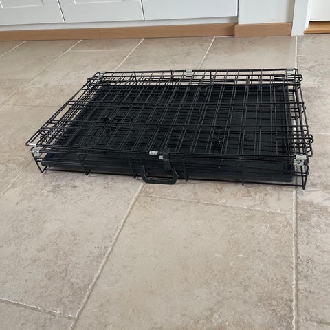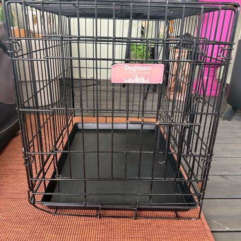 Sammenleggbar hundebur i svart metall med uttakbar bunnskuff i plast. Buret kan foldes flatt for enkel oppbevaring og transport, og har bærehåndtak på oversiden. Egnet som hvile- og oppholdssted for hund i hjemmet eller på reise, for eksempel i bil eller på besøk. Størrelse 60/45/45