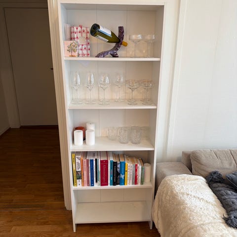 IKEA bokhylle i hvit utførelse. Høy, smal modell med flere faste hyller som gir plass til bøker, permer og oppbevaringsbokser. Egnet til bruk i stue, soverom, kontor eller gang for organisering og lagring langs vegg. Designet er enkelt og funksjonelt, og bokhyllen passer inn i de fleste interiørstiler.
