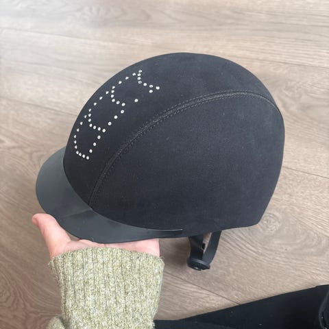 Casco ridehjelm i svart farge. Hjelmen har ventilasjonshull i front og dekorative sømmer langs sidene. Justerbare reimer under haken. Egnet til ridning og annen hestesport.