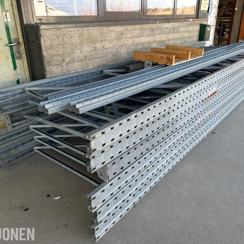 Det er totalt 25 stående pilarer i lakkert utførelse (se bilder). Noen få av disse har blitt påsveiset kroker, brannslukkere etc.,men alle kan gjenbrukes. Lengde fra fot til anlegg for bjelker er 330 cm. Det er fire hull i hver fot for montering i gulv.