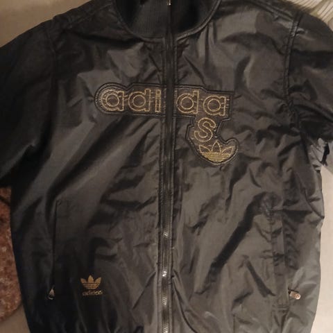 Adidas jakke for herre i størrelse M. Jakken er blå med Adidas-logo på brystet og tre striper på øvre del av ryggen. Modellen har høy krage og glidelås i front. Det er glidelåslommer i sidene. Yttermaterialet er i syntetisk stoff, typisk for lett vatterte eller vindavvisende jakker fra Adidas. Passer til hverdagsbruk og lett trening i kjøligere vær.