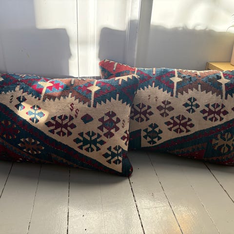 Vakre vintage kelimputer i duse farger selges. Deler nye, som i nylagede, og vintage kelim som er sydd av er nyrenset. Baksiden er av 100% bomullsfløyel og det er knappelukking. De avlange er supre til å gi sin sofa et unikt uttrykk med bohemsk tilsnitt.