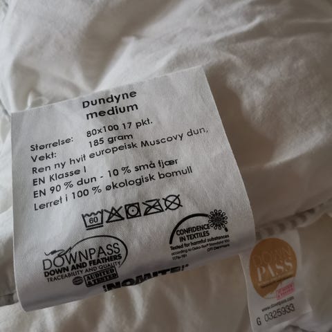 Dozy dundyne i størrelse 65x80 cm. Dynen er fylt med 90 % muscovy-dun og 10 % små fjær, med en bæreevne på 725 CUIN og fyllvekt 45 gram ren hvit europeisk dun. Trekket er laget av 100 % økologisk bomull. Dynen har TOG-verdi 3,5 og er merket med Downafresh og Nomite. Egnet som lett dundyne, for eksempel til barneseng eller barnevogn, der målene passer.