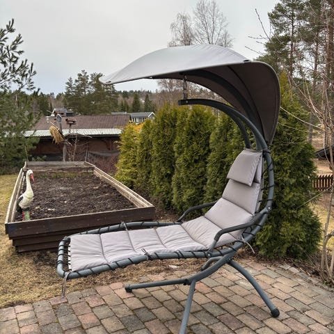 Sammenleggbar solstol med hvitt tekstiltrekk og ramme i metall. Stolen har justerbar ryggdel og lang liggedel som gir full liggelengde. Egnet for bruk på terrasse, hage eller uteplass. Tekstilen er spent fast i rammen med åpninger i hjørnene, og rammen har ben som kan slås sammen for enklere lagring og transport.