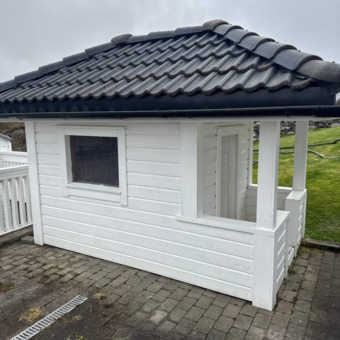 Vakker lekehytte snekret av far og sønn selges. Denne lekehytten er snekret fra bunnen og opp av dyktig snekker og sønn. Det første bildet er sånn som den ser ut nå, og de andre bildene er eldre, derfor mangler det vinduer og dører.