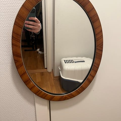 Retro speil med tredetaljer. Speilet har tre separate speilflater, med et større midtspeil og to smalere sidespeil som kan vinkles. Rammen er i teak. Egner seg for veggmontering på soverom, gang eller bad, der det er behov for et funksjonelt speil med flere vinkler.Hull på baksiden for å henge på vegg.