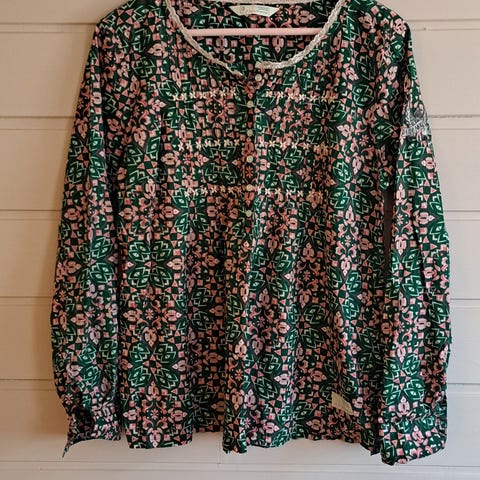 Odd Molly bluse i størrelse L for dame. Blusen er flerfarget med mønster og laget i viskose. Den har lange ermer og lett, tynn kvalitet som faller mykt. Snorer med metallperler, og hippiemønsher. Passer til hverdagsbruk eller mer pyntede anledninger, og kan kombineres med både bukser og skjørt.