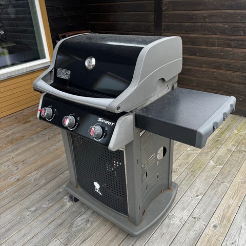 Weber Spirit gassgrill i rustfritt stål. Grillen har tre brennere pluss sidebrennere.