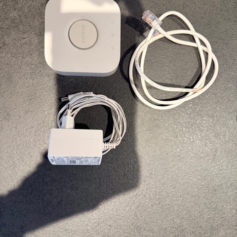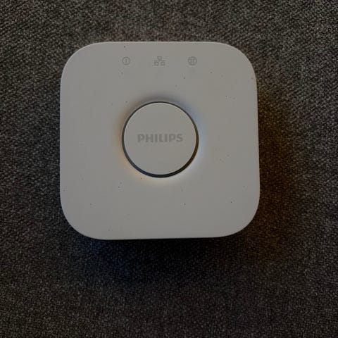 Philips Hue Bridge i hvit farge. Dette er kontrollenheten for Philips Hue smartbelysning, som kobles til hjemmenettverket via nettverkskabel og strømforsyning. Enheten gjør det mulig å styre kompatible Philips Hue-lyskilder og tilbehør gjennom app eller andre støttede systemer. Strømadapter følger med. Se bilder.