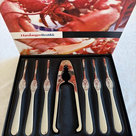 Hardanger Bestikk, skalldyrsett i stål. Settet inneholder en nøtteknekker/skalldyrknekker og flere skalldyrgafler, levert i eske med tilpasset innmat. Bestikket er merket «Hardanger 18/8 Norway», som angir rustfritt stål 18/8. Egnet til servering og rensing av ulike typer skalldyr som krabbe og hummer.