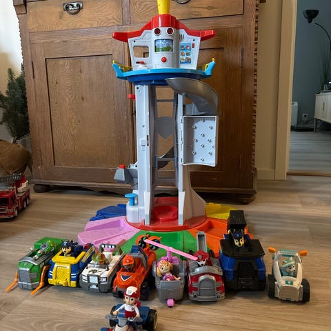 Paw Patrol lekekjøretøy sett med flere kjøretøy. Settet inneholder blant annet en stor redningsbåt, brannbil med stige, lastebil og mindre kjøretøy. Lekekjøretøyene er i plast og har farger inspirert av Paw Patrol-universet, som rødt, blått, gult og hvitt.