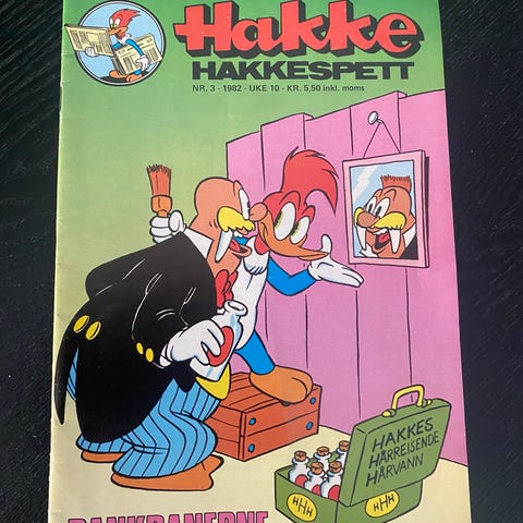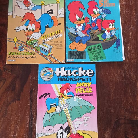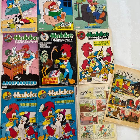 Hakke Hakkespett tegneserieblader i hefteformat. Fargerike omslag og innhold med klassiske Hakke Hakkespett-historier i tegneserieform. Heftene inneholder flere korte historier med tekst og illustrasjoner på norsk. Egner seg for lesing og samling for barn og voksne som liker klassiske tegneserier.