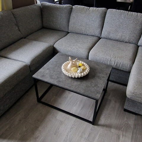 Corner sofa in grey fabric. The sofa has an angular design with a chaise longue at each end, and straight, simple lines. The seat and back cushions are loose. Suitable as a main sofa in a living room or TV room, and provides more seating along the wall or in the corner of the room. smoke-free and pet-free house. no damage/ stains on the sofa. washable fabric