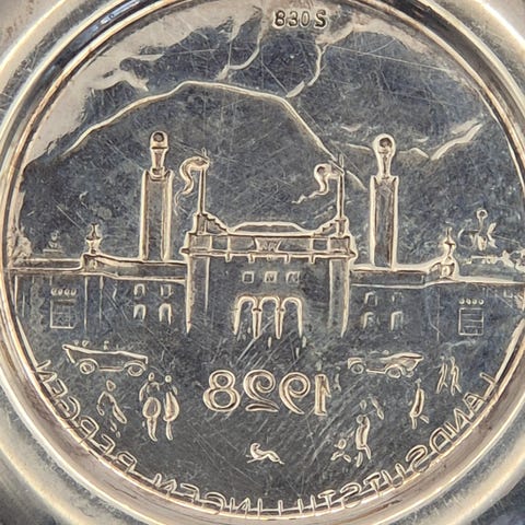 Bilderamme, kopp, snusdåse og et par bøsser i sølv. 18/1900-tallet.