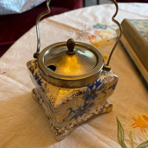 Sølv, 17/1800-tallet. Hjerteformet, rikt utført i rokokkostil med forgylt kronet avslutning.