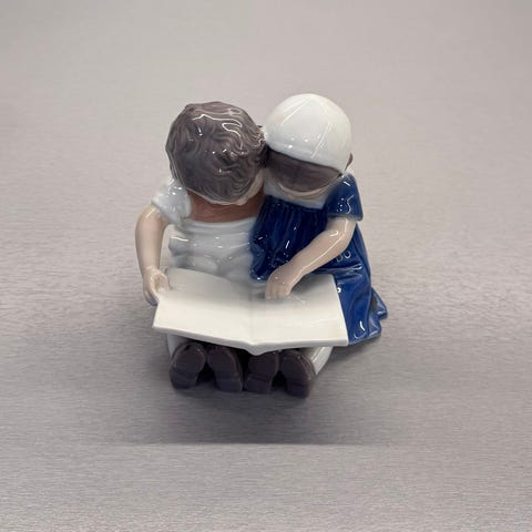 Bing & Grøndahl porselensfigur som forestiller en jente i blå kjole med flette. Figuren står på en rund sokkel og holder en liten mugge i hånden. Glasert overflate i hvite og blå nyanser. Produsentstempel fra Bing & Grøndahl Copenhagen under sokkelen. Egnet som samleobjekt eller dekorativ figur i vitrineskap, på hylle eller bord.