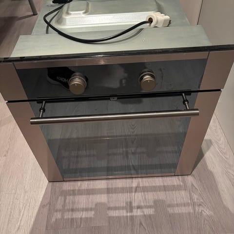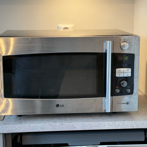 Integrert mikrobølgeovn i rustfritt stål med sort front og glassdør. Ovnen har roterende glassplate inni og betjeningspanel med dreiehjul, knapper og digitalt display i front. Den er beregnet for innbygging i kjøkkeninnredning og egner seg til oppvarming og enkel tilberedning av mat. Ovnen fremstår som en standard integrert modell med grillfunksjon og flere innstillinger for tid og effekt.