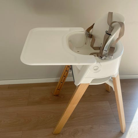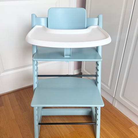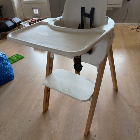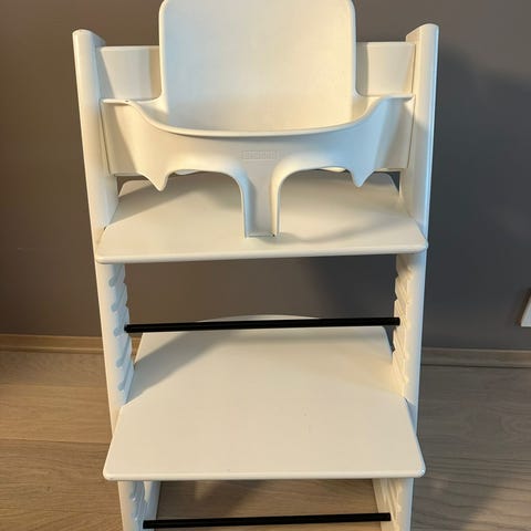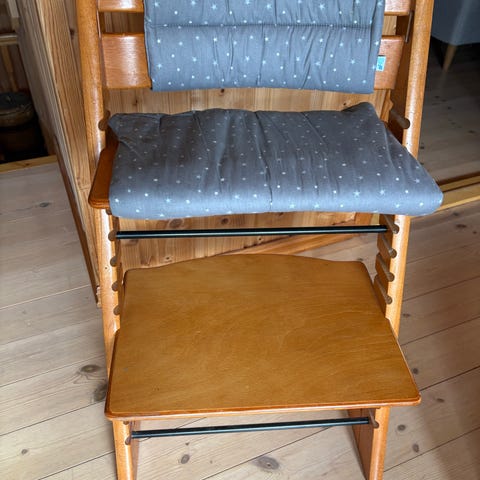 Pent brukt Stokke tripp trapp-stol med spisebrett og pute