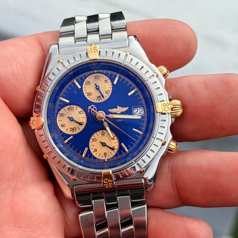 Selger en meget pen og klassisk Breitling Chronomat fra 1997 med nydelig blå skive og gull-detaljer. Dette er en ikonisk modell fra Breitling sin storhetstid på 90-tallet, og begynner å bli ettertraktet blant samlere.