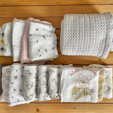 Fire pent brukte babytepper; to helsetepper og to myke tepper i økologisk bomullsmusselin. Brukt i omtrent tre måneder.