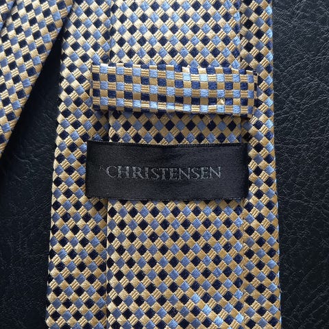 Burgundergullbrunt (ubestemmelig farge), stripete sikeslips. Avvikende blå/svart og hvitprikkete stoff inni. 100% silke