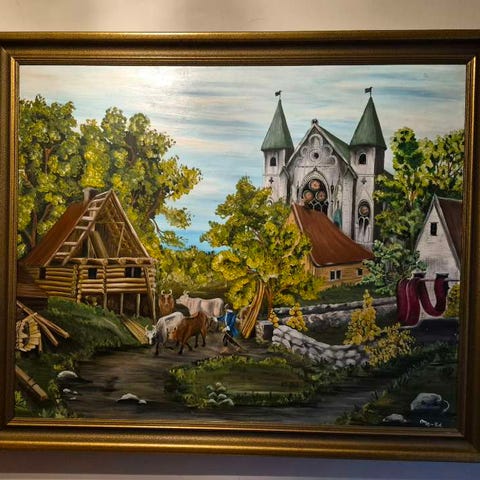 Gammelt maleri av en historisk bygning og flotte omgivelser. Bildet har duse grønnfarger, og enkel ramme, men har særpreg og sjel. Det er ikke signert, men kanskje noen kjenner historien til kunstneren? Kan leveres i omr. Sandnes, eller sendes m postnord. Har også mye annen kunst!