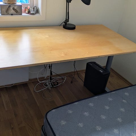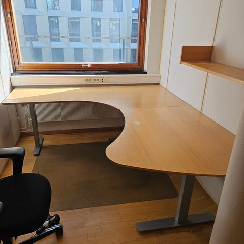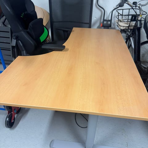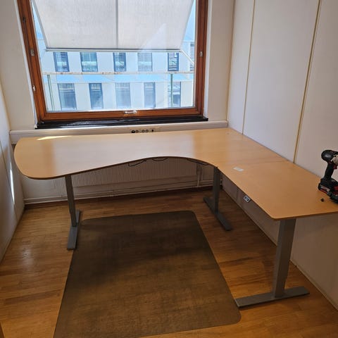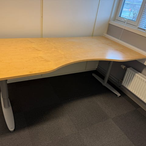 2 stk skrivebord gis bort til den som kan hente det først. Befinner seg i Rælingen. Mål er 160x80 cm,en den grå buede enden kan skrus av og da blir bordet 140x80 cm. Manuell hev/senk funksjon.