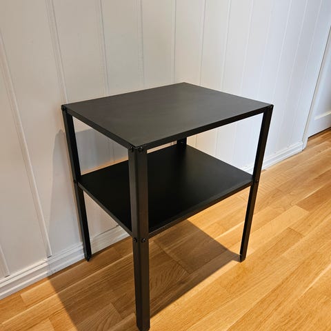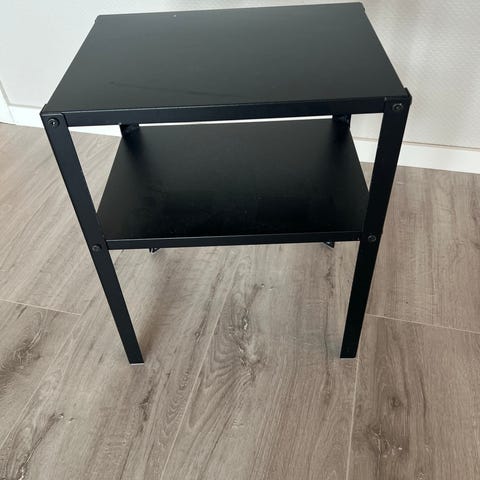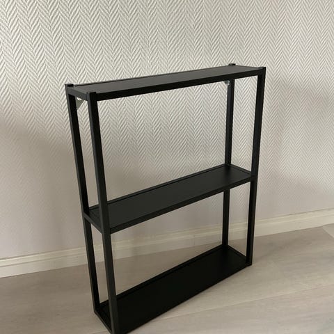 Vegghengte nattbord/hylle i sortlakkert metall. Solide og plassbesparende!