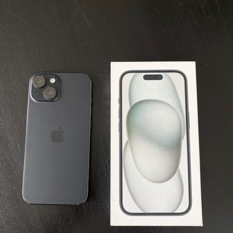 Apple iPhone 15 Plus mobiltelefon med 128 GB lagringskapasitet i hvit farge.