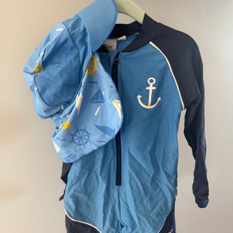 UV-drakt og solhatt blå str. 86-92