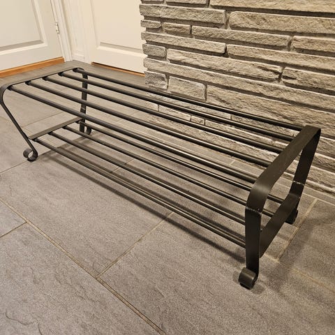 Selger en fin skohylle i sortmalt jern. Hyllen har to etasjer med god plass til sko og støvletter, og det åpne designet gjør at den er enkel å holde ren.
