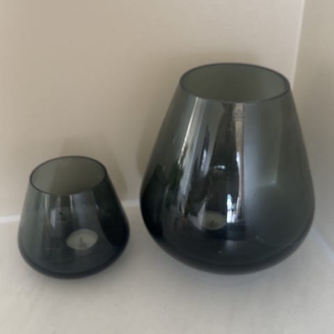 Magnor Glassverk glassvaser i sett med to størrelser. Vasenes form er rund med smalere åpning øverst. Begge er laget i røkfarget glass/koksgrå.