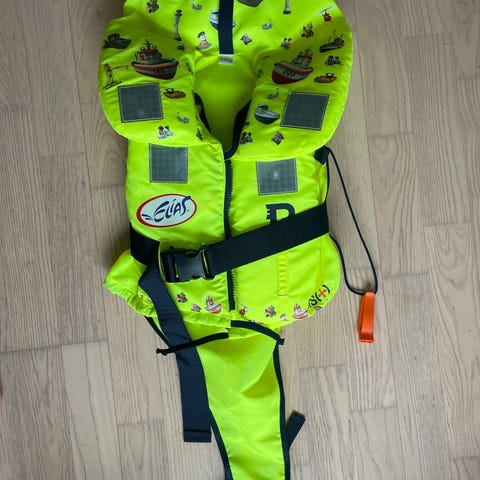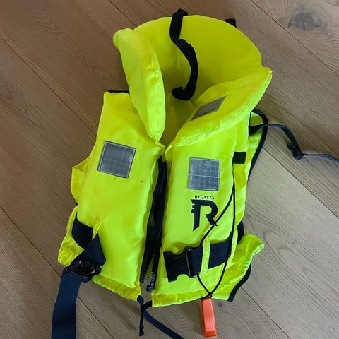 Regatta redningsvest for barn i gul farge. Vesten har krage, refleksfelt foran, beltespenne og snøring for justering. Den har også fløyte festet i snor og motiv med båt på ryggen. Egnet som flyteutstyr for barn ved bruk i båt og nær vann.