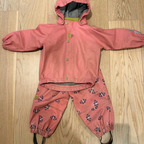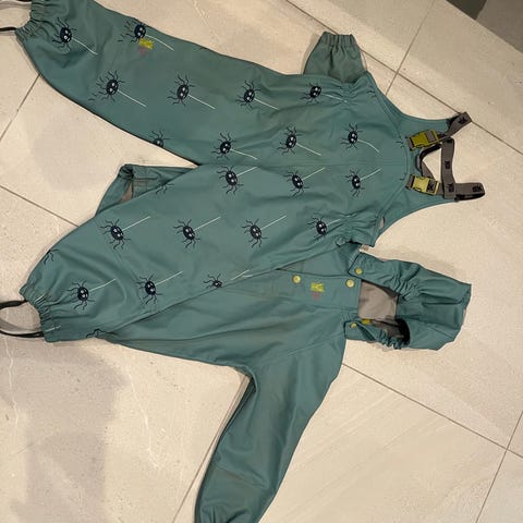 Kattnakken plask regnsett i str. 110. Godt brukt, men fungerer som det skal og er helt tett. Glidelås, knapper, sømmer og fotstropper er intakte. Har noe bruksmerker/misfarging særlig på buksen - se bilder